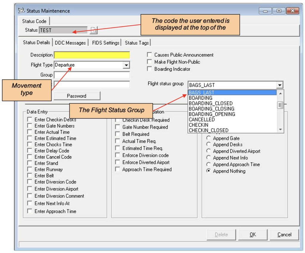 This screen allows the user to define any inputs required when this status is selected, any validation required and whether anything needs to be appended to the message the status generates.